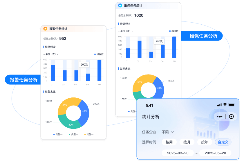 通过多维度统计分析,呈现维保任务的总数、执行频次、不同类型任务的占比情况,为维保计划的优化提供数据支持。