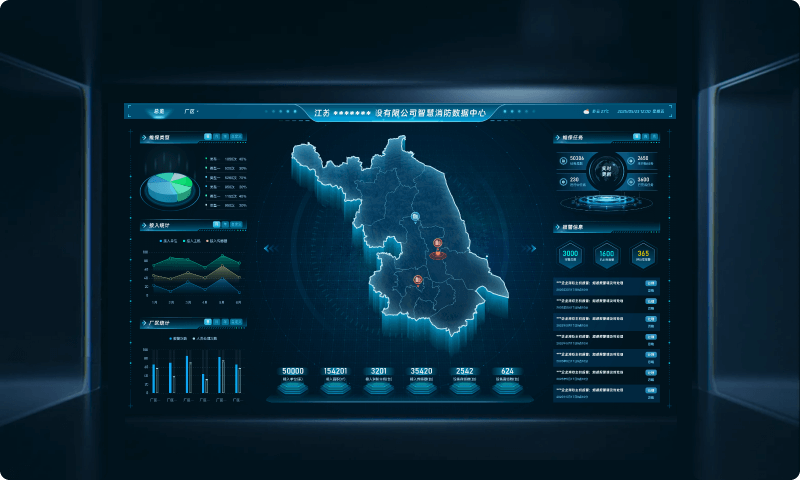 大屏展示界面分为左右两侧数据总览区域,清晰呈现报警信息、设备状态、维保任务统计分析等关键数据。中间区域通过三维地图实现报警信息的精准定位与实时查看,为管理决策提供全面、直观的数据支持,助力管理者高效掌控整体消防状况。