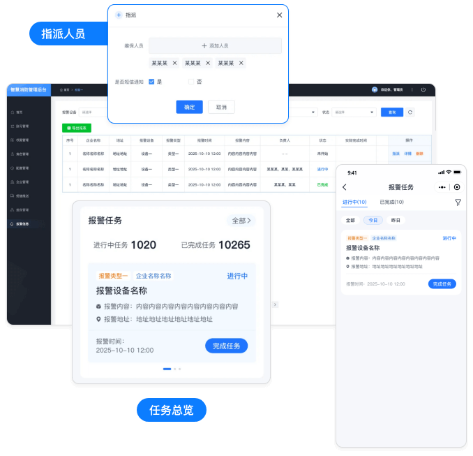 系统与设备实时联动,设备报警时自动触发生成报警任务,后台迅速捕捉并响应,支持快速指派给多名处理人员,有效缩短应急响应时间,提升应急处置效率。